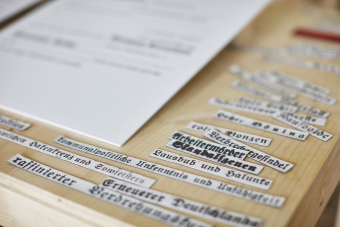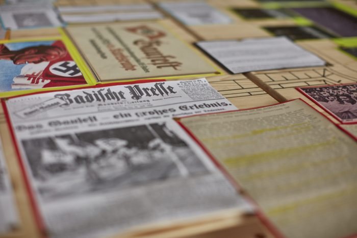 Aller guten Dinge sind drei – heißt es gemeinhin, und ja, auch wir können dieser Aussage etwas abgewinnen, denn bereits zum dritten Mal begaben sich in diesem Schuljahr Interessierte dreier Gymnasien auf Spurensuche zum Nationalsozialismus in Karlsruhe. So konnten SchülerInnen des Bismarck-, Goethe- und Helmholtz-Gymnasiums von den in den vergangenen beiden Schuljahren gesammelten Erfahrungen in hohem Maße profitieren, ist doch eine Verstetigung der Qualität der wissenschaftlichen Arbeiten, der künstlerischen Objekte sowie des Ausstellungsdesigns zuträglich. Aus diesen drei Komponenten setzen sich die Werke zusammen, die die TeilnehmerInnen des schulübergreifenden Seminarkurses erstellen.
